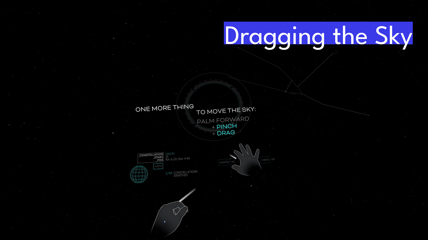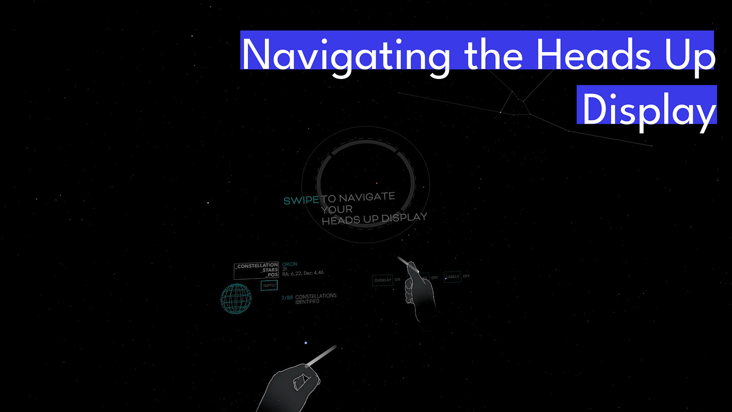 A quick introduction to navigating the heads up display follows... to open a constellation, ensure the "Inspect" button is highlighted, then tap your left or right thumb when a constellation name appears in the heads up display. The rings in the heads up display indicate when a palm forward is detected, and directional indicators light up as you drag the "sky dome".