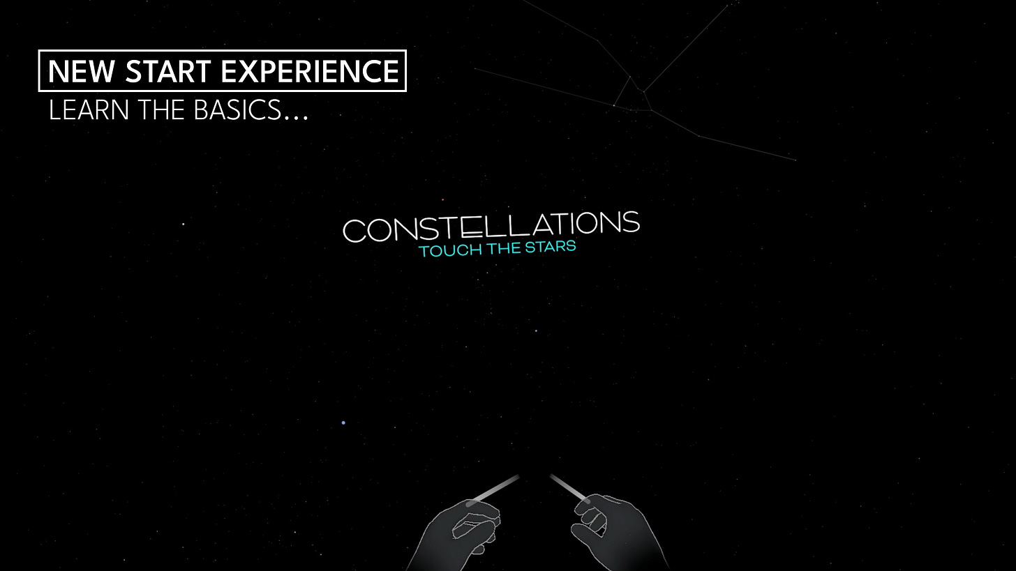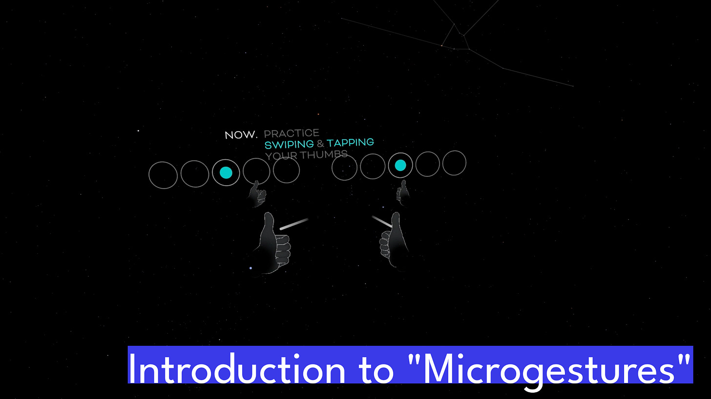 3. Thumb Swiping and Tapping - “Microgestures” were introduced on the Quest platform in the spring of last year and provide thumb swipe and thumb tap detection. In CONSTELLATIONS, you navigate the main menu by swiping with your thumbs. A thumb tap selects the menu item in focus.