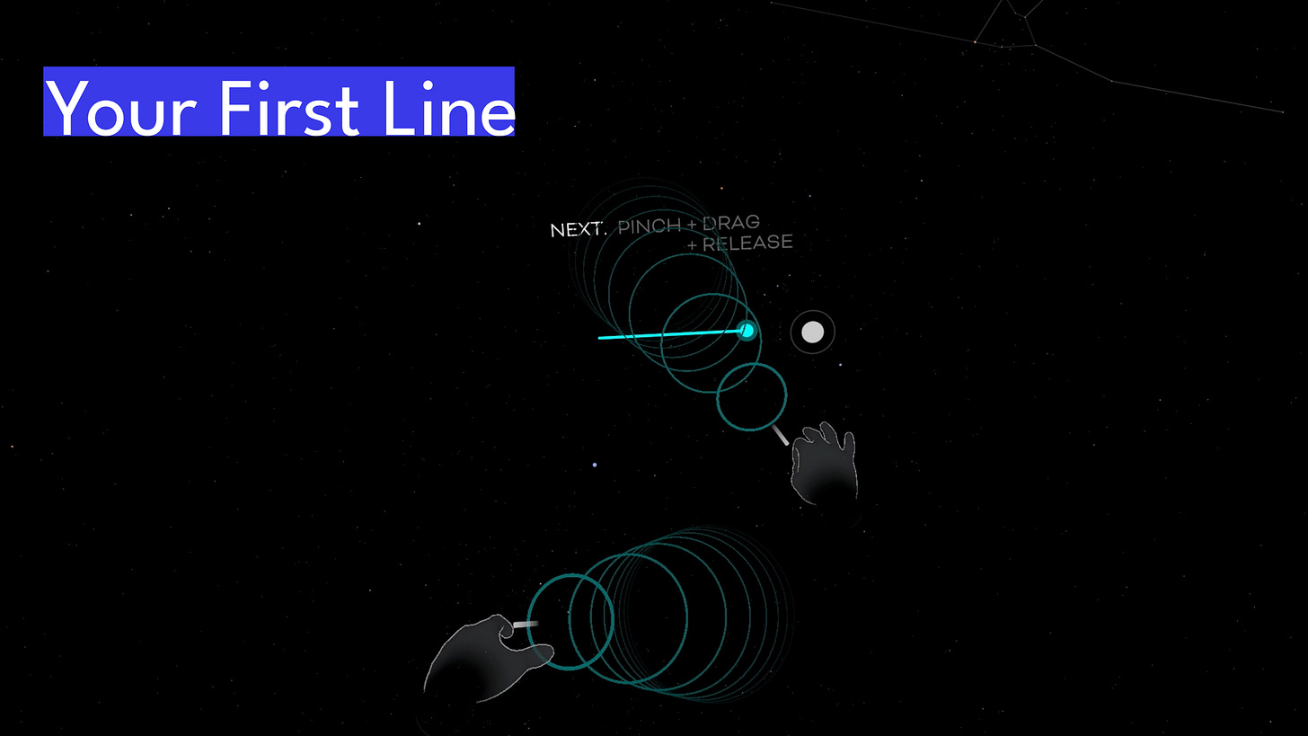 2. Connecting Dots - Once you know how to pinch, you’re ready to create your first line. Pinch, hold, and drag from one point to the next. Starting with a single line reduces “analysis paralysis” that can arise with multiple options. Completing a single line leads to a try a few more step that introduces multiple lines. The real intention of this step is to ensure the player understands that points are not all in the same plane. You may have to push and pull the line for it to meet its target. Dotted line adorners are drawn to indicate depth.