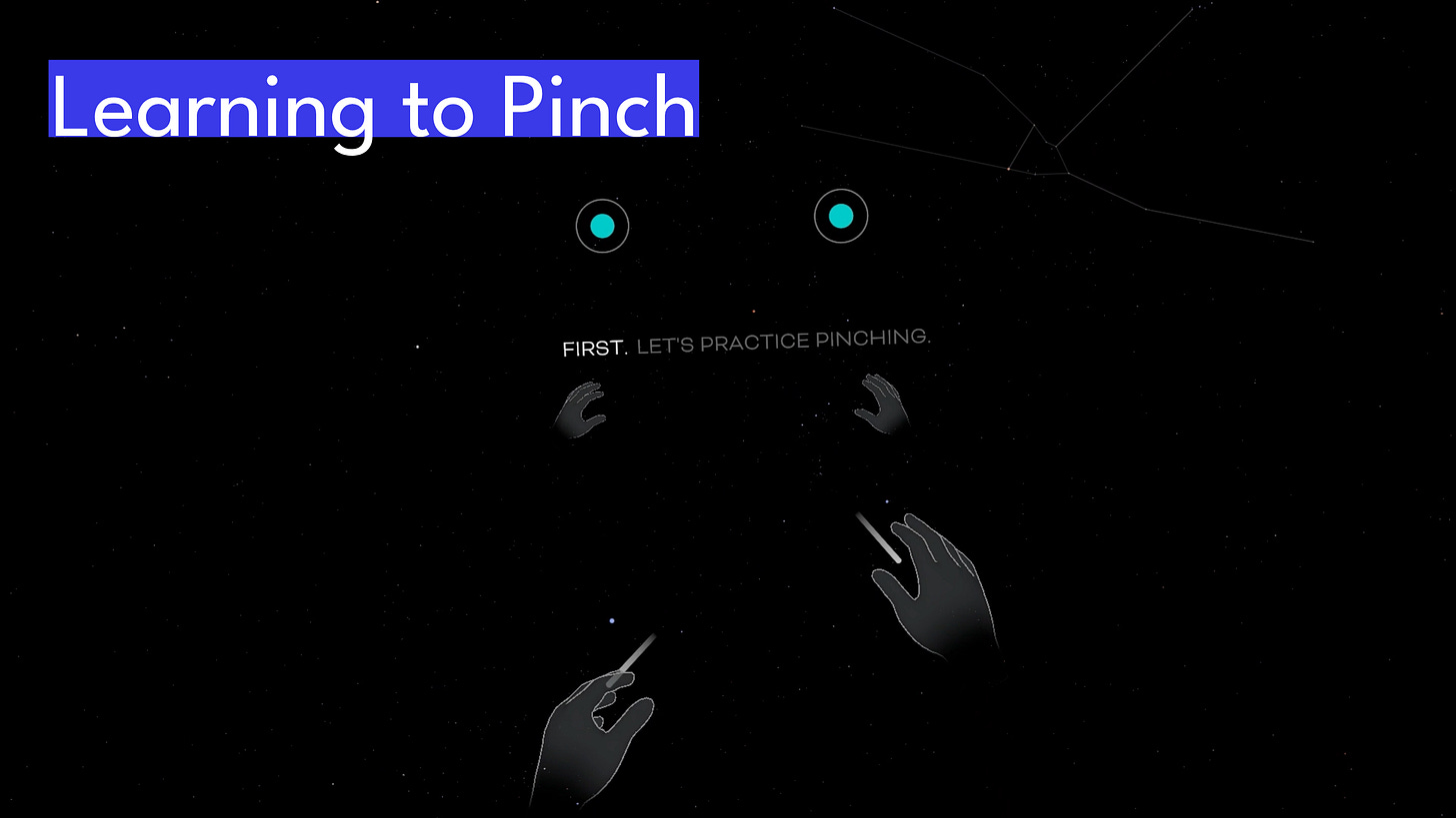 1. Learning to Pinch - I start by ensuring sure you know how to pinch. Three quick pinches with each hand and you’re on to the next step... It may seem obvious, but pinching in VR requires intentionality. The cameras need to see enough movement between the thumb and the forefinger for the gesture to be recognized as a pinch.